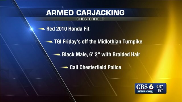 CHESTERFIELD COUNTY, Va. -- Chesterfield Police are working to track down the suspect believed to be involved in an armed carjacking. Officers are looking for a red 2010 Honda Fit. The victim told police a man stole his car from the TGI Friday's off Midlothian Turnpike at gunpoint sometime late Friday night. The victim was not hurt.