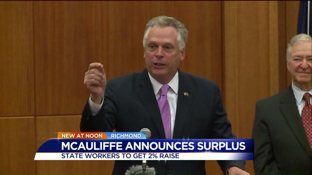 RICHMOND, Va. -- Virginia Governor Terry McAuliffe announced "our economy is back" Monday morning when he said Virginia ended the fiscal year with the largest budget revenue surplus in state history -- $553.3 million. The surplus will result in two percent pay raises for state workers, the governor said.