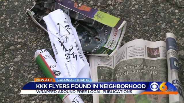 COLONIAL HEIGHTS, Va. -- Neighbors of one Central Virginia neighborhood are sounding the alarm after dozens of Ku Klux Klan flyers were found at the end of several driveways.