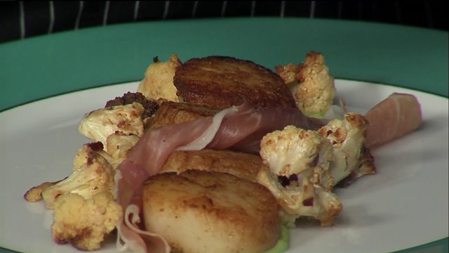 Seared Scallops with Minted Pea Puree, Charred Cauliflower and Prosciutto