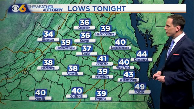 RICHMOND, Va. -- After reaching highs in the lower 80s, a strong cold front passed late Saturday, ushering in much cooler weather. Low temperatures Sunday morning dropped down into the low and mid 40s for many locations.
