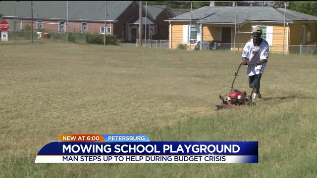 PETERSBURG, Va. – A Petersburg man gave the city a helping hand Monday when he volunteered his services to cut grass at a Petersburg elementary school.