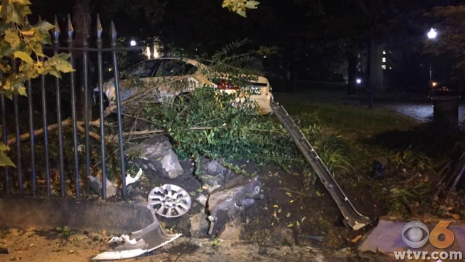 RICHMOND, Va. -- Two people were hurt when their car ran off Franklin Street in downtown Richmond, slammed into a fence around the Virginia State Capitol, and ended up on the Capitol lawn. Bent fencing and car parts were seen strewn about the Capitol grounds.