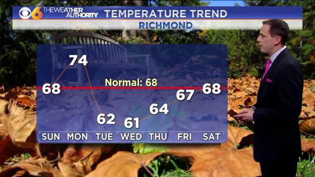 Temperatures will rebound back to around 70° Sunday afternoon and into the low and mid 70s on Monday. A cold front will come through during Monday, and this will drop highs back into the 60s for the rest of the week. It will be chilly again on Tuesday and Wednesday mornings with lows in the 30s and lower 40s.