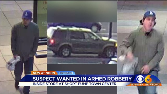 "While the victim spoke with the male, he displayed a handgun and demanded merchandise. The victim complied and the suspect fled the store. The suspect was last seen entering an SUV which then left the parking lot," Henrico Police spokesman Lt. Chris Garrett said.