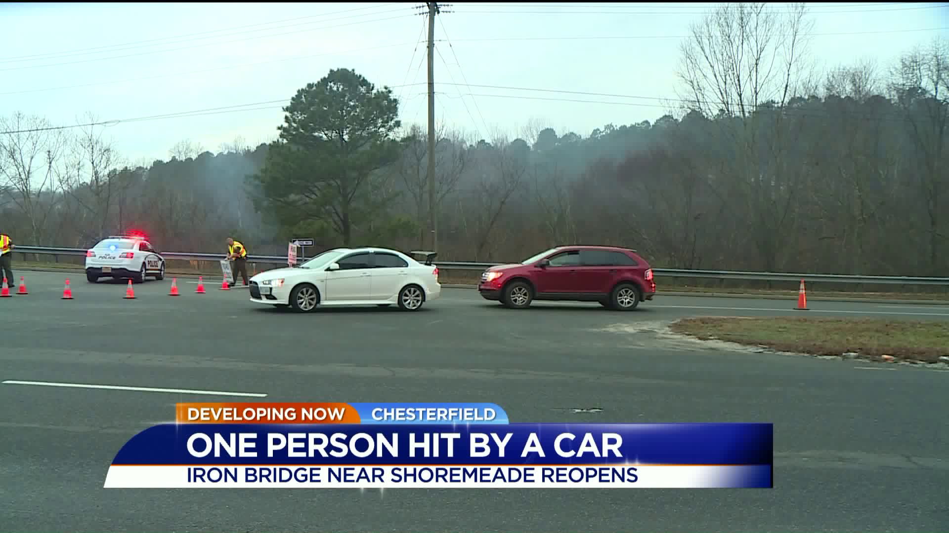 CHESTERFIELD COUNTY, Va. -- An accident involving a car and a man walking along the road closed lanes on Iron Bridge Road (Route 10) near Shoremeade Road in Chesterfield. The man who was struck by a vehicle, at about 5 a.m. Thursday, was taken to VCU Medical Center with serious injuries.