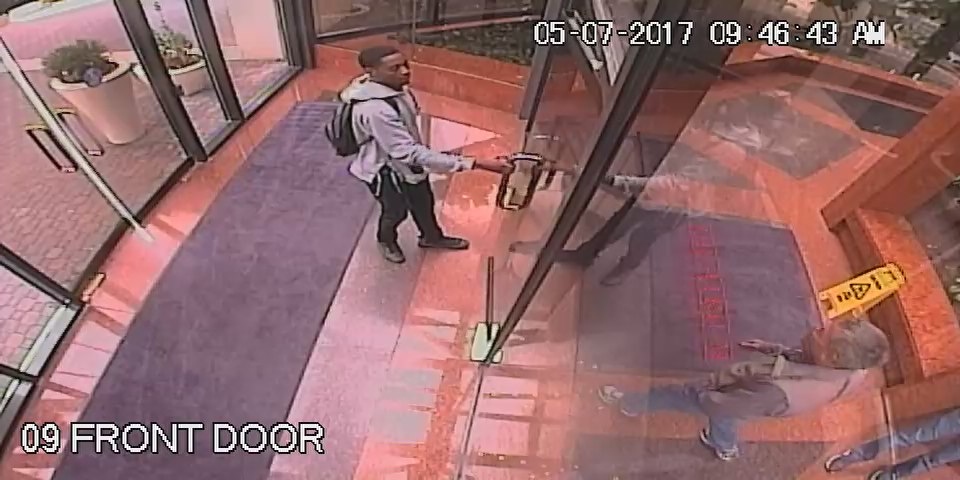 The suspect is described as a black male in his early 20s, approximately 6’0″ tall with a slim build. He was last seen wearing a gray hooded sweatshirt with dark pants and carrying a backpack.