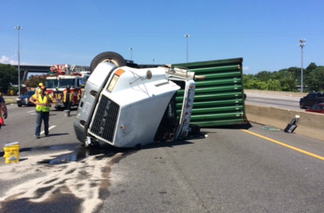 State Police spokesman Sgt. Steve Vick said a 2000 Mack tractor trailer was traveling south bound on I-95 when it lost control and overturned in the left and center lanes.