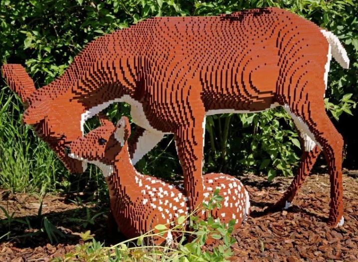 Brooklyn artist and children's author Sean Kenney designed the sculptures, which include a six-foot hummingbird hovering over a trumpet flower, a deer family made from 48,000 bricks, a giant tortoise, a seven-foot dragonfly and more.