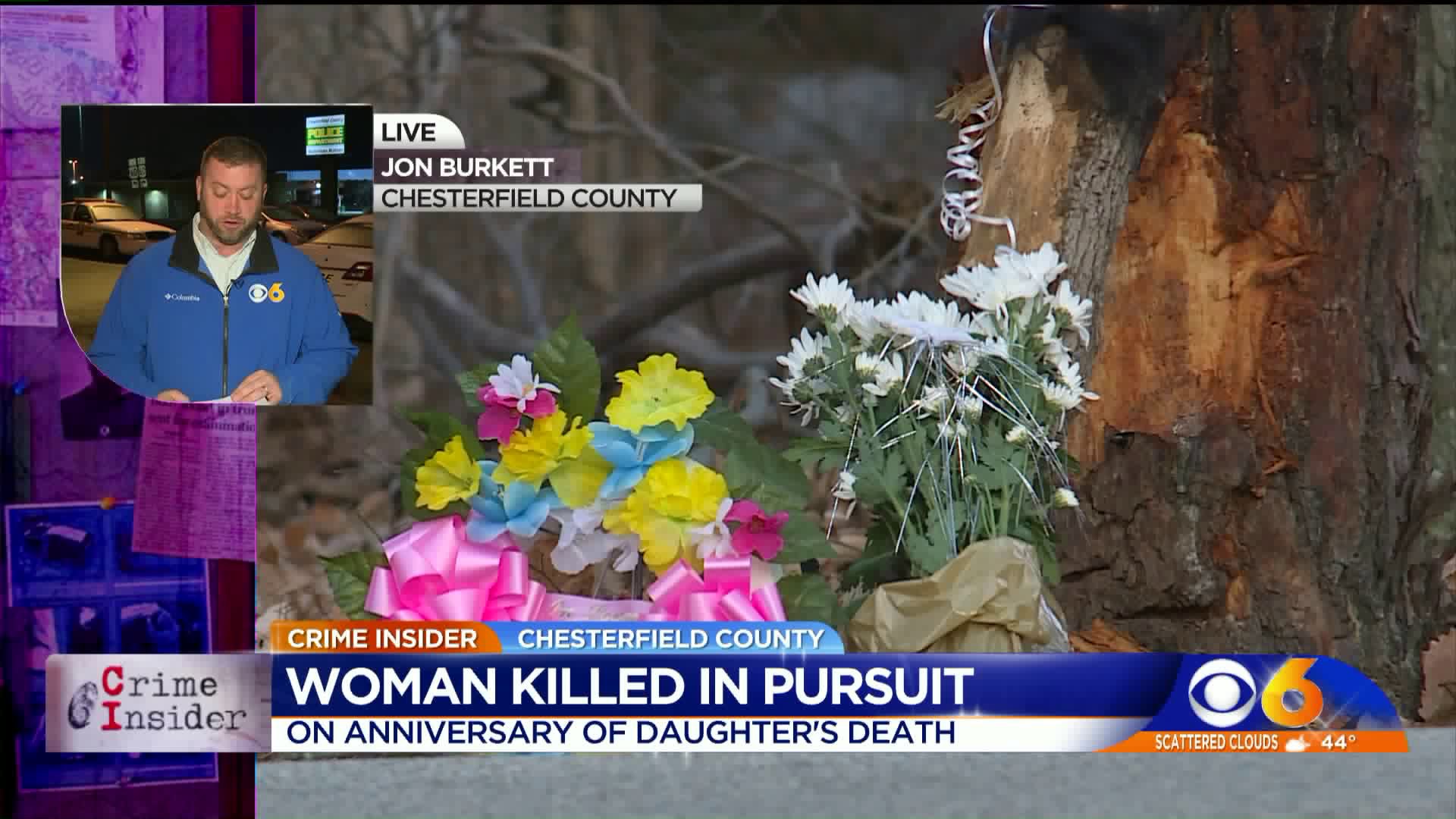 CHESTERFIELD COUNTY, Va. – A Chesterfield County woman, who police say led them on a pursuit before crashing into a tree, died Sunday on the fourth anniversary of daughter’s death.