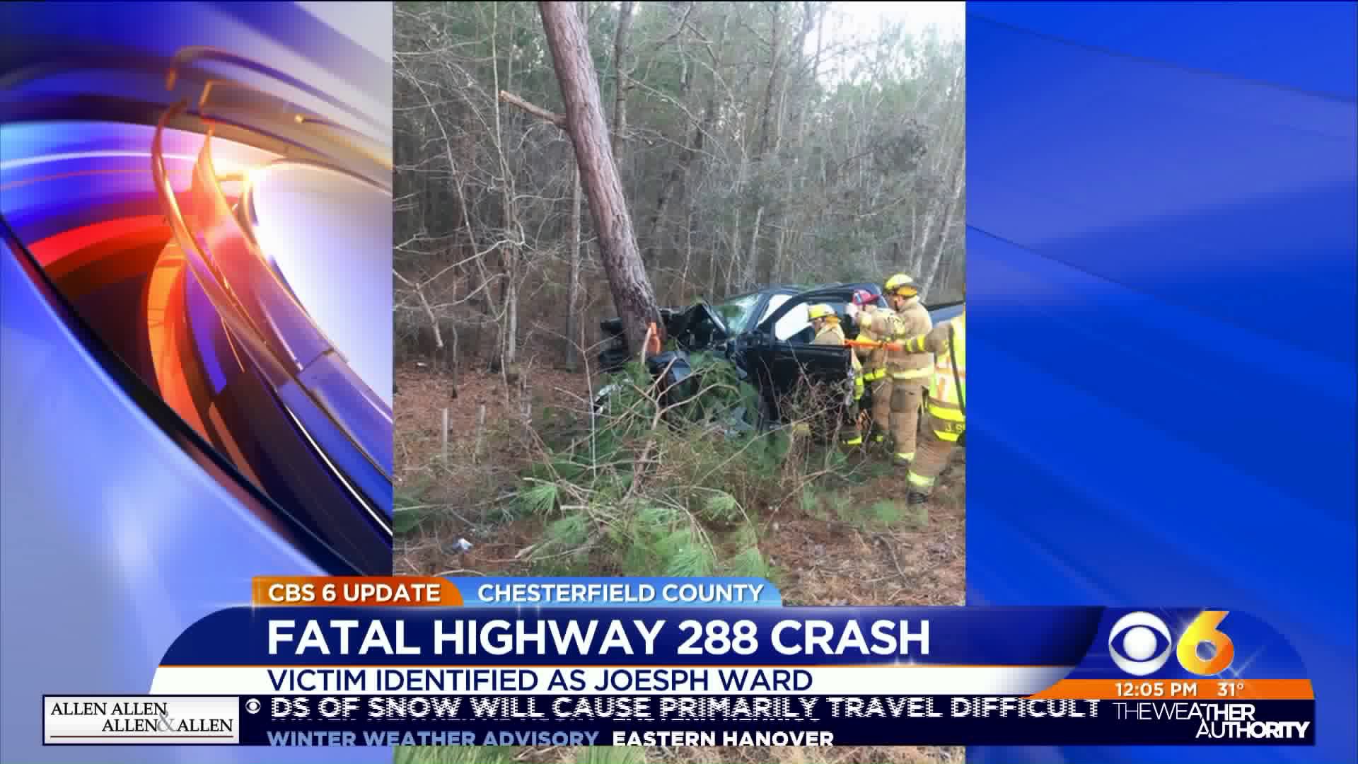 CHESTERFIELD COUNTY, Va. -- Police identified the Chesterfield man killed in a crash on Route 288 Monday as Joseph Christopher Ward, 29, of North Chesterfield.