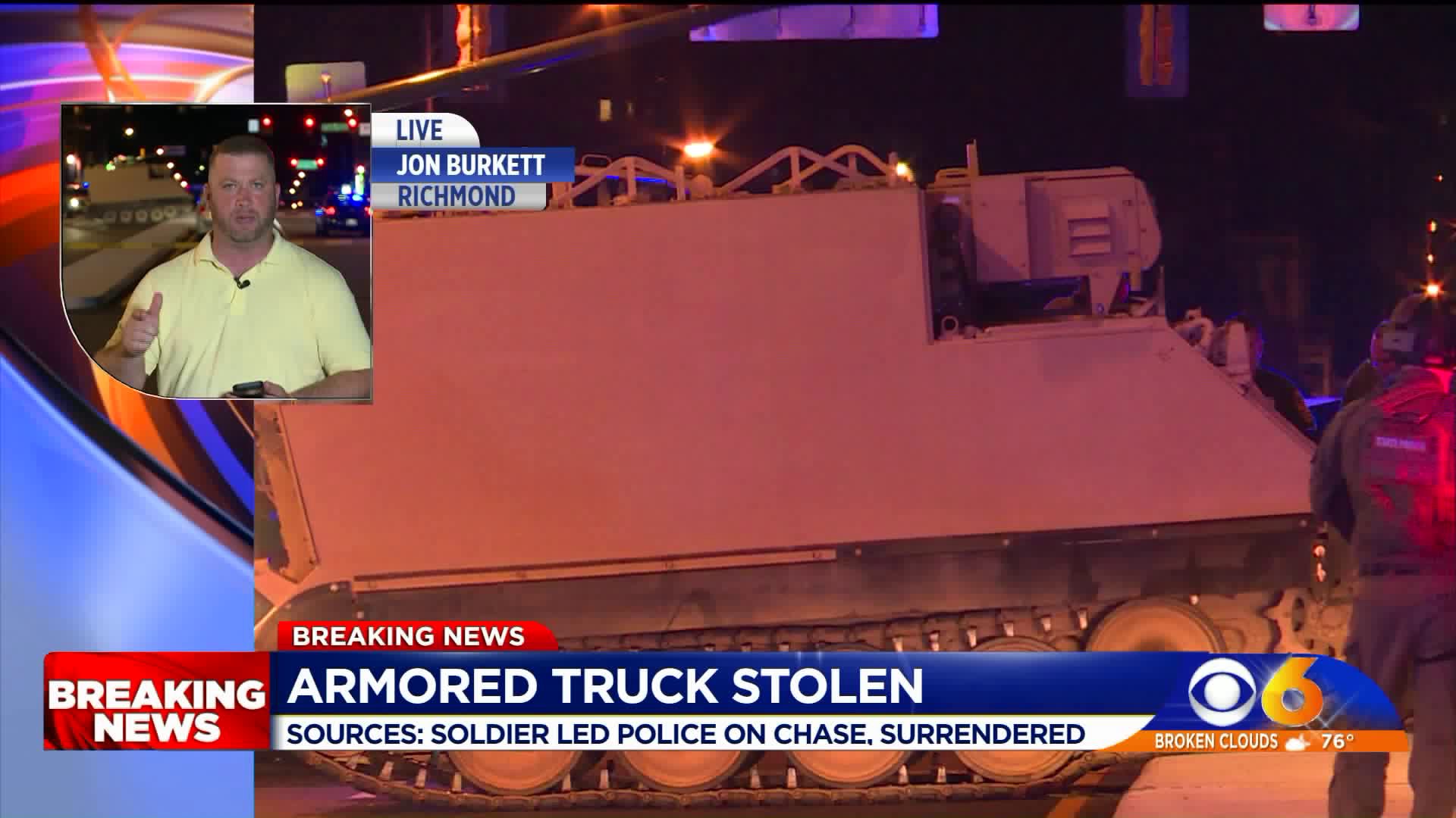 CBS 6 senior reporter Wayne Covil reported the suspect stole the military vehicle from Fort Pickett and drove it from Nottoway County to I-85 to I-95 in Richmond.