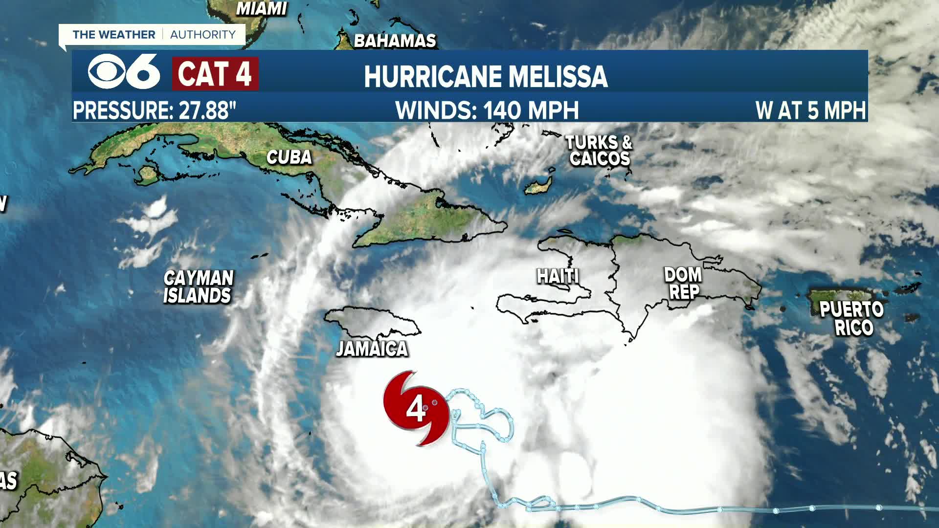 Melissa was centered about 110 miles (180 kilometers) south-southeast of Kingston, Jamaica, and about 280 miles (445 kilometers) south-southwest of Guantanamo, Cuba, on Sunday morning. It had maximum sustained winds of 140 mph (220 kph) and was moving west at 3 mph (5 kph), the hurricane center said.