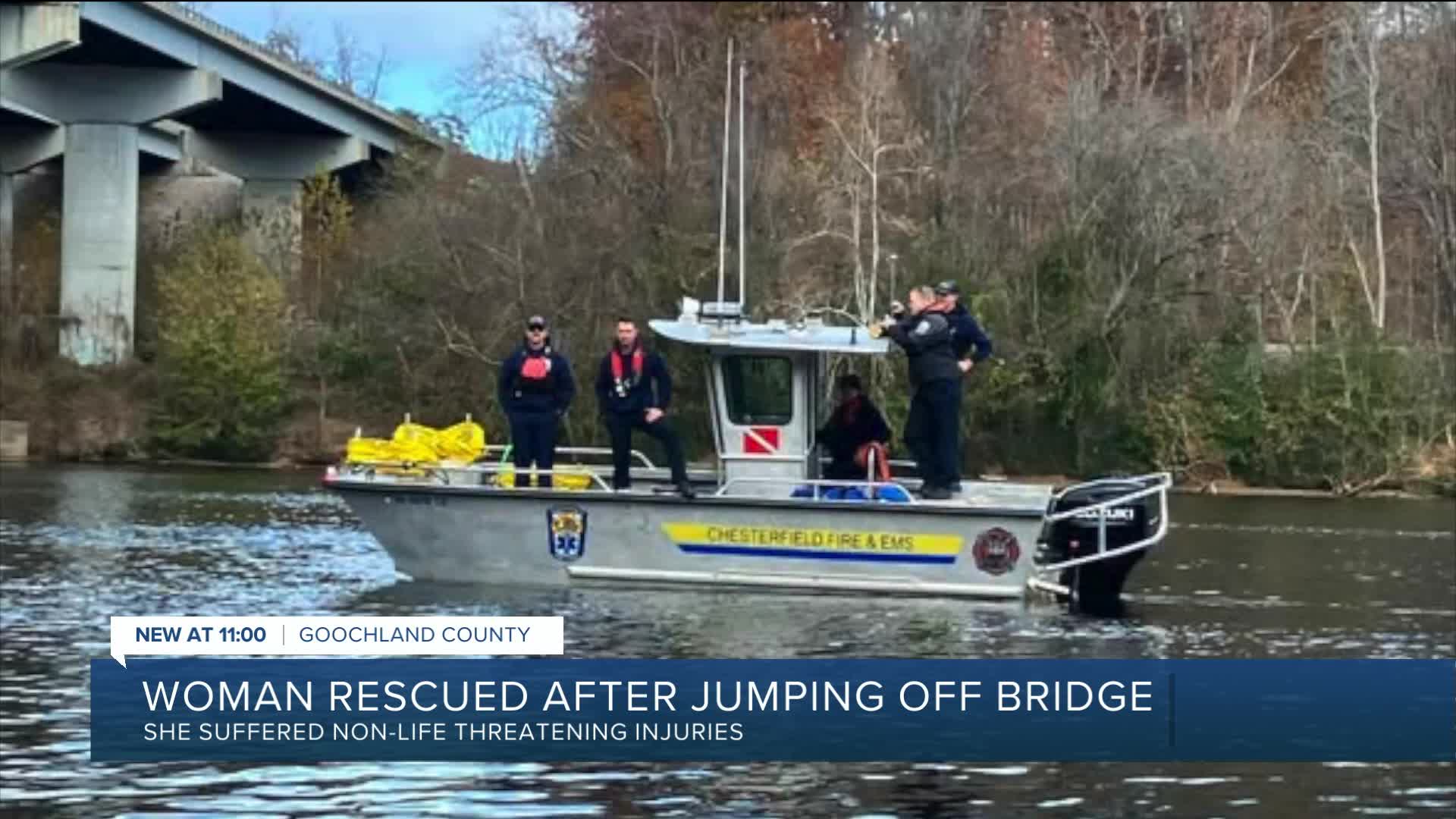 GOOCHLAND COUNTY, Va. — A woman who jumped off the Route 288 bridge in Goochland County on Friday after was rescued by Chesterfield Fire and EMS’s MedFlight crews, according to an agency spokesperson and Virginia State Police.