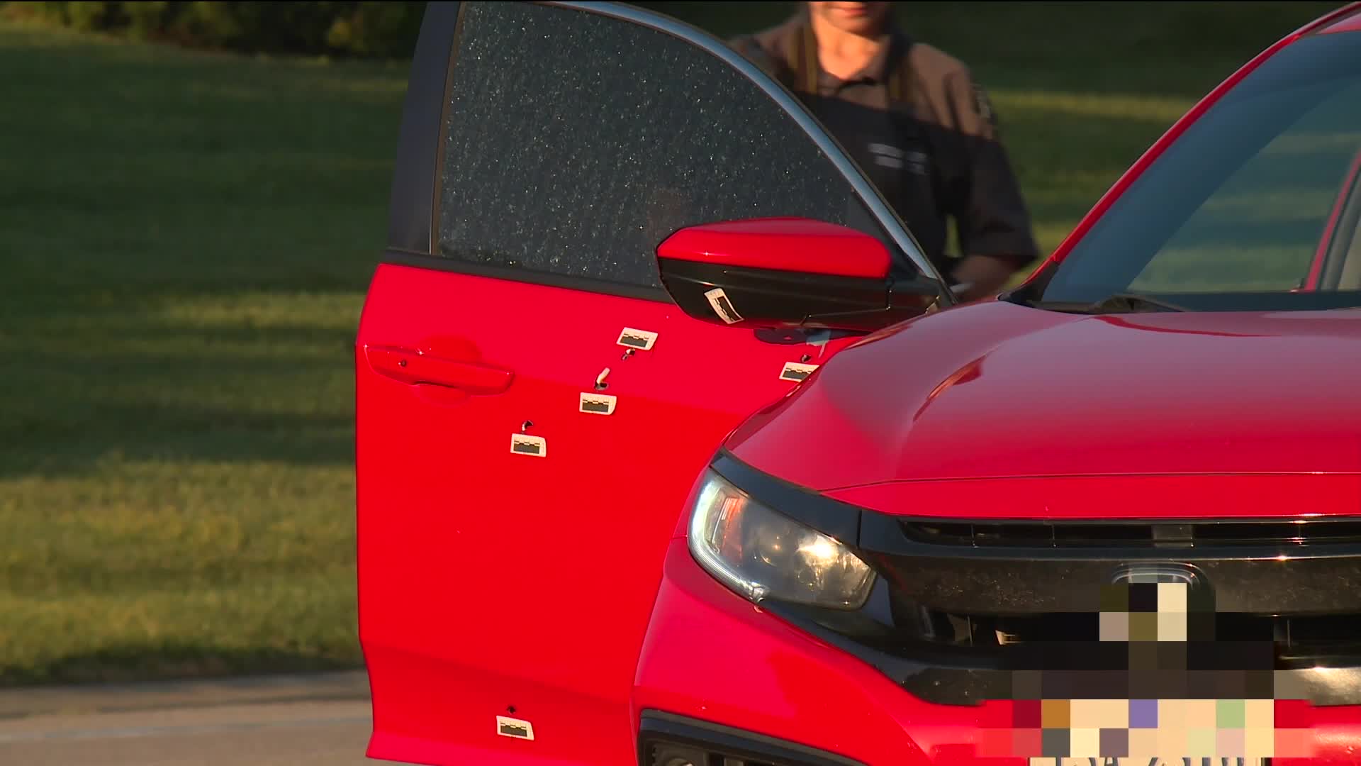 Forensics officers collected evidence from the victim's car, which had bullet holes and damaged windows on both sides of the vehicle.