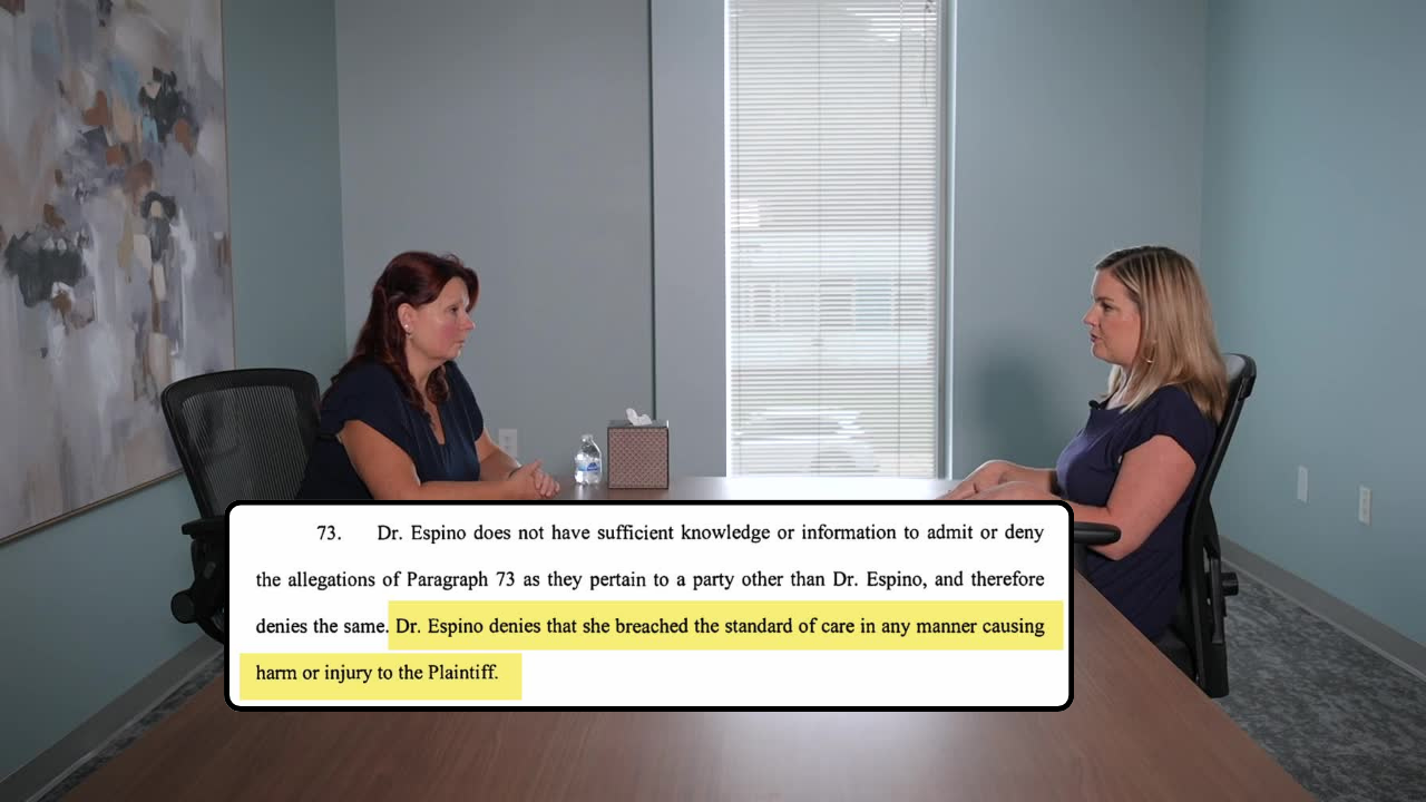 Espino denies that she "breached the standard of care in any manner causing harm or injury to Moore” in her legal response.