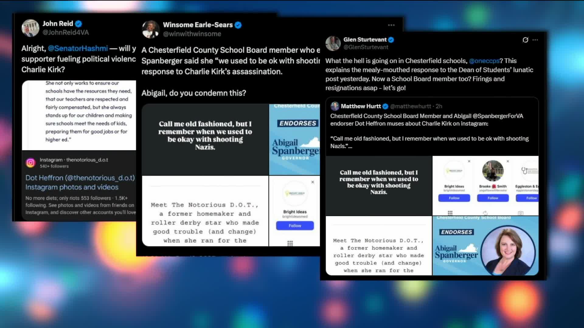 CHESTERFIELD COUNTY, Va. — Several prominent Virginia Republicans are expressing outrage over social media posts that appear to come from two Chesterfield County school leaders in the wake of the fatal shooting of conservative activist Charlie Kirk.
