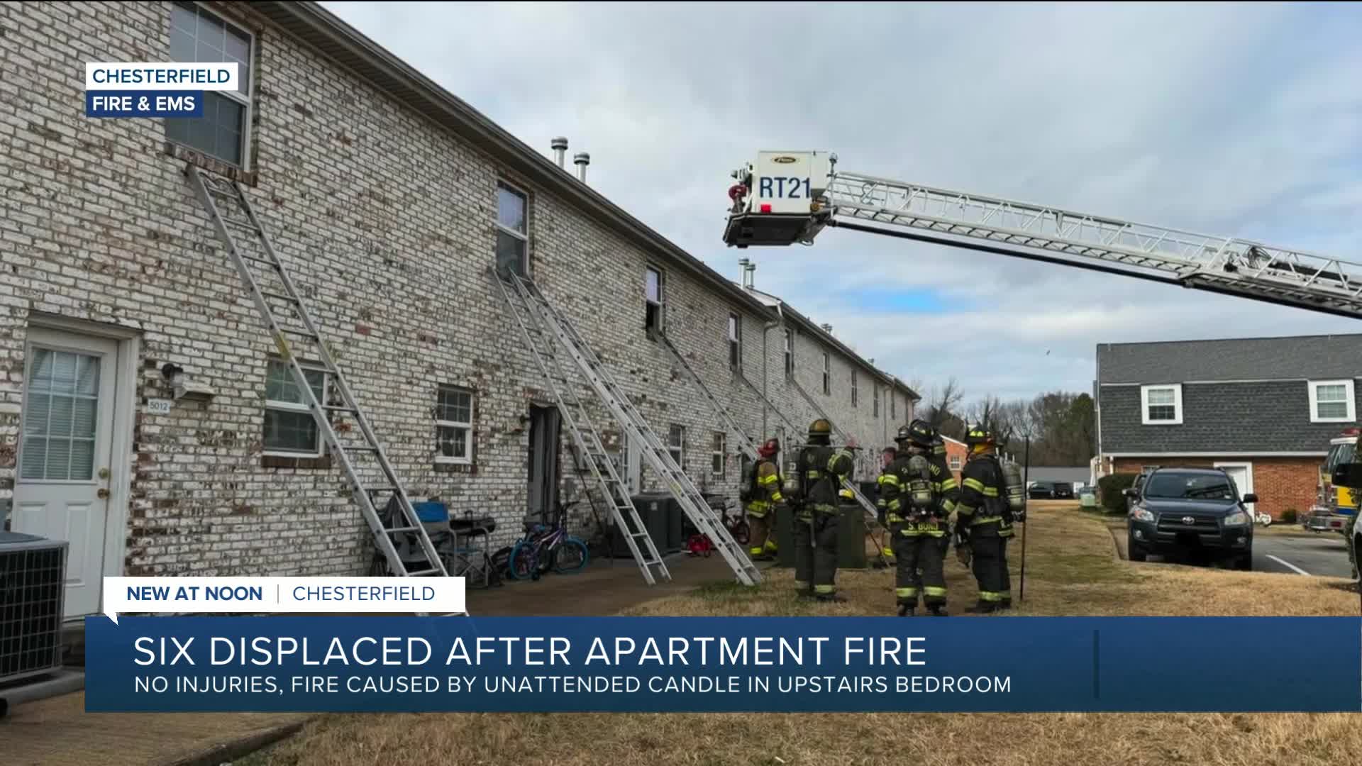 CHESTERFIELD COUNTY, Va. β Six people are displaced after an unattended candle sparked a fire in a Chesterfield County apartment Wednesday afternoon, according to Chesterfield Fire and EMS.