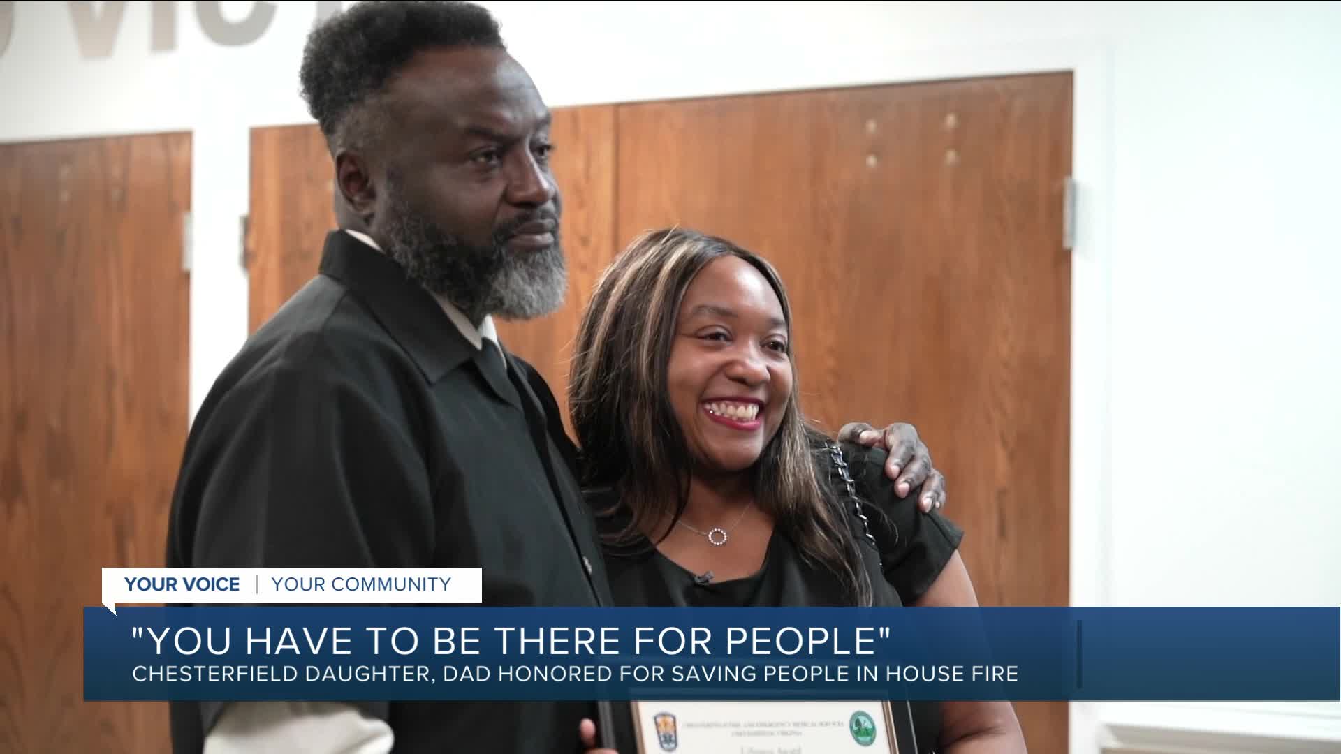 CHESTERFIELD COUNTY, VA — A Chesterfield woman and her father received an award from Chesterfield Fire and EMS Tuesday night for rescuing two neighbors from a house fire earlier this year.
