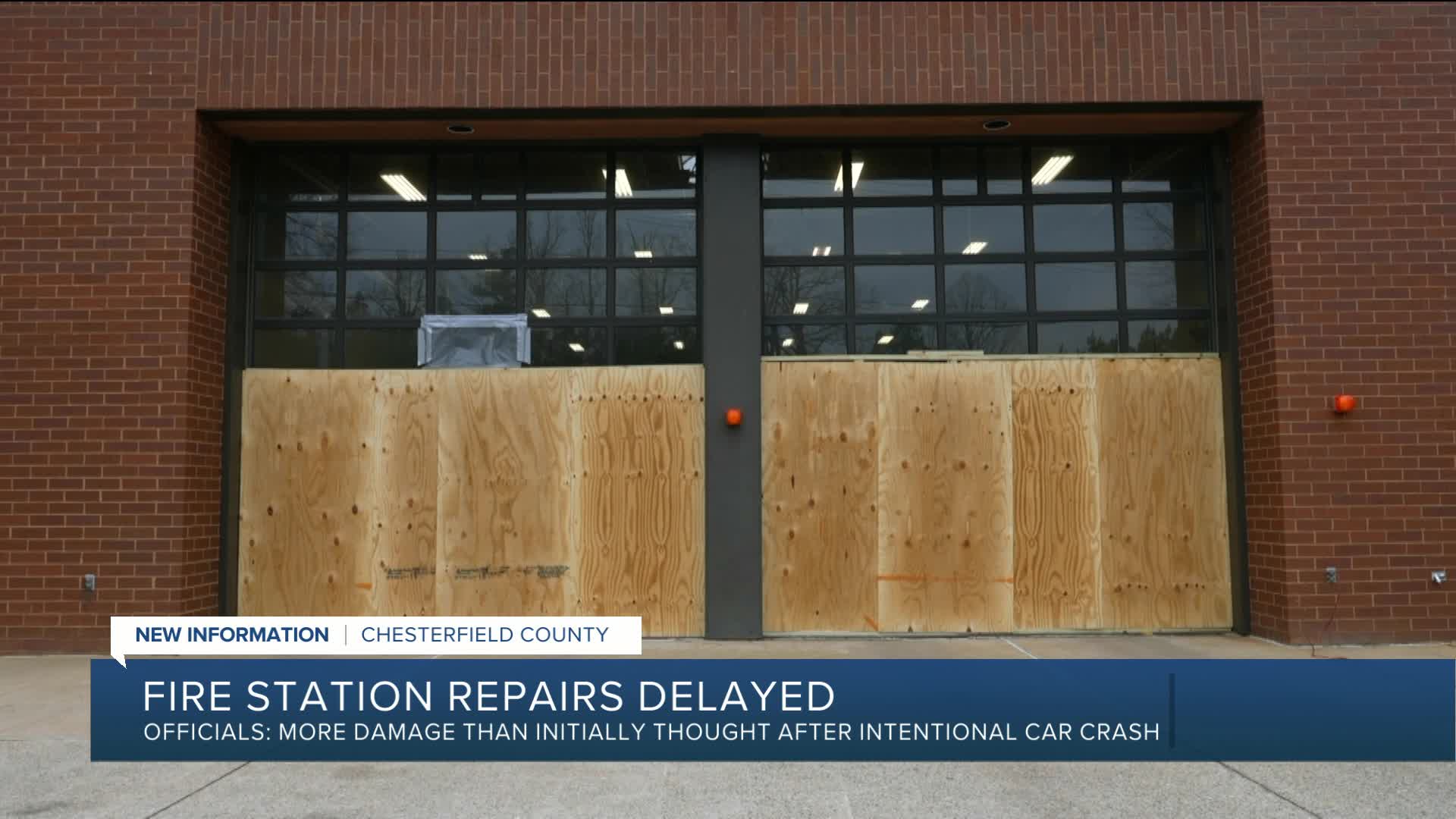CHESTERFIELD COUNTY, Va. β More than two weeks after an 18-year-old intentionally crashed a stolen car into a Chesterfield fire station, repairs are taking longer than expected due to extensive damage.