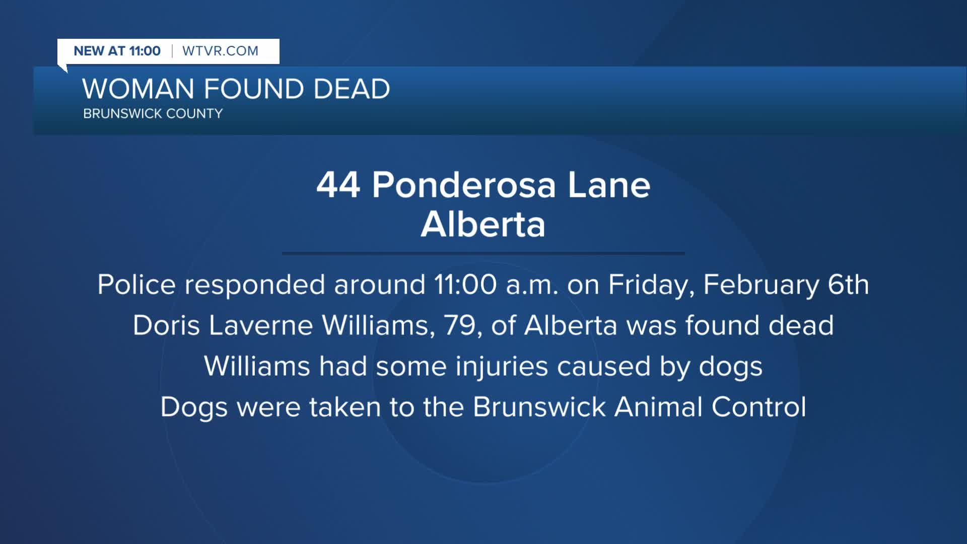 Deputies found Doris Laverne Williams deceased in the backyard of her home on Ponderosa Lane in Alberta around 11 a.m. on Friday, Feb. 6.