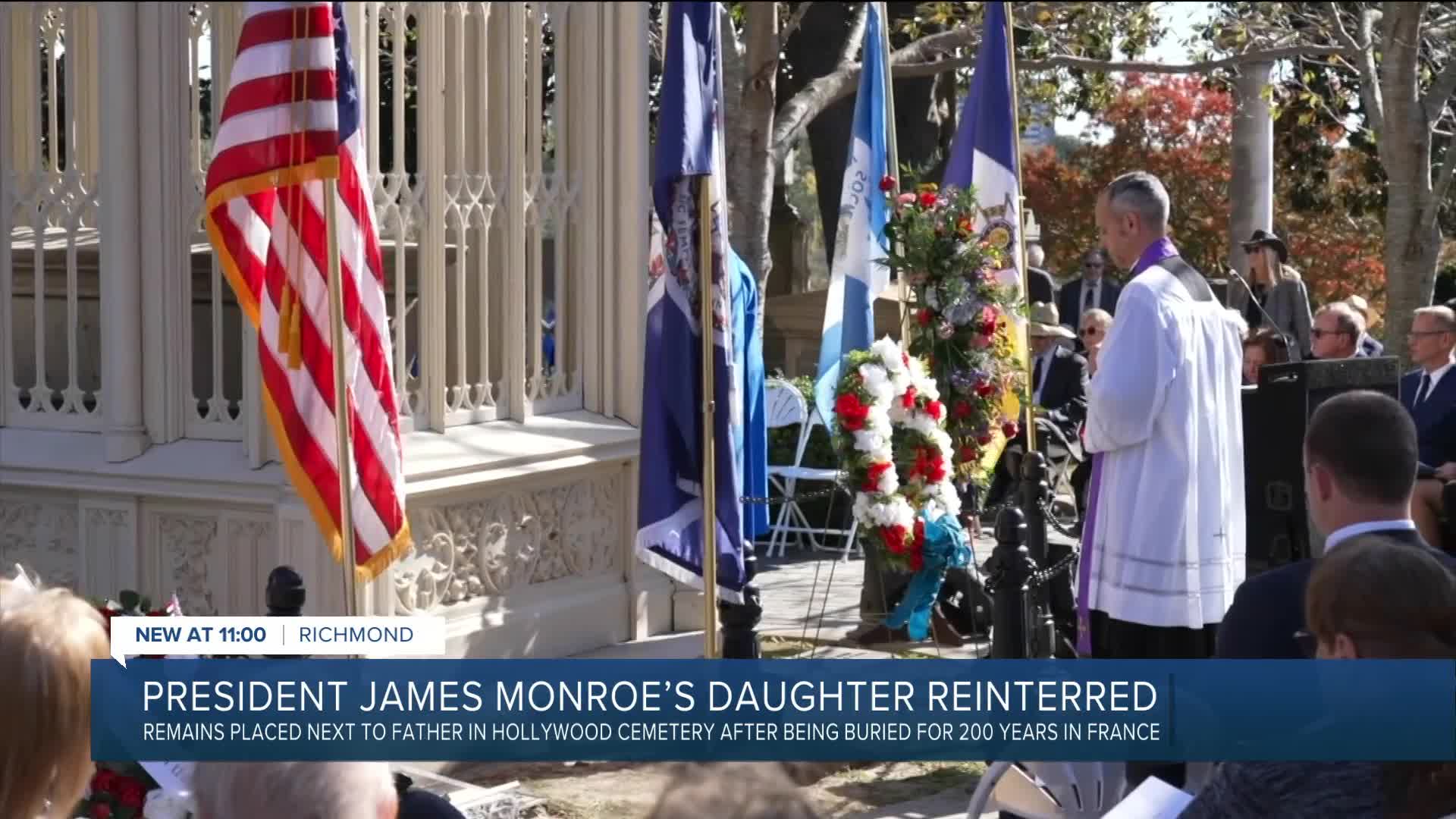 RICHMOND, Va. — After nearly two centuries in an unmarked grave abroad, the remains of Elizabeth "Eliza" Kortright Monroe Hay, daughter of fifth U.S. President James Monroe, have finally been laid to rest in Richmond's Hollywood Cemetery.