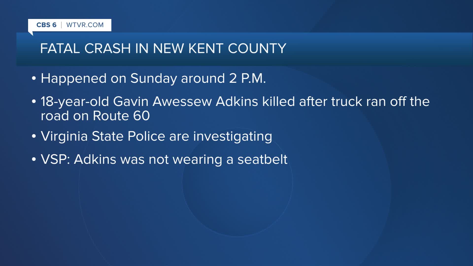 Virginia State Police identified the deceased driver as 18-year-old Gavin Awessew Adkins.