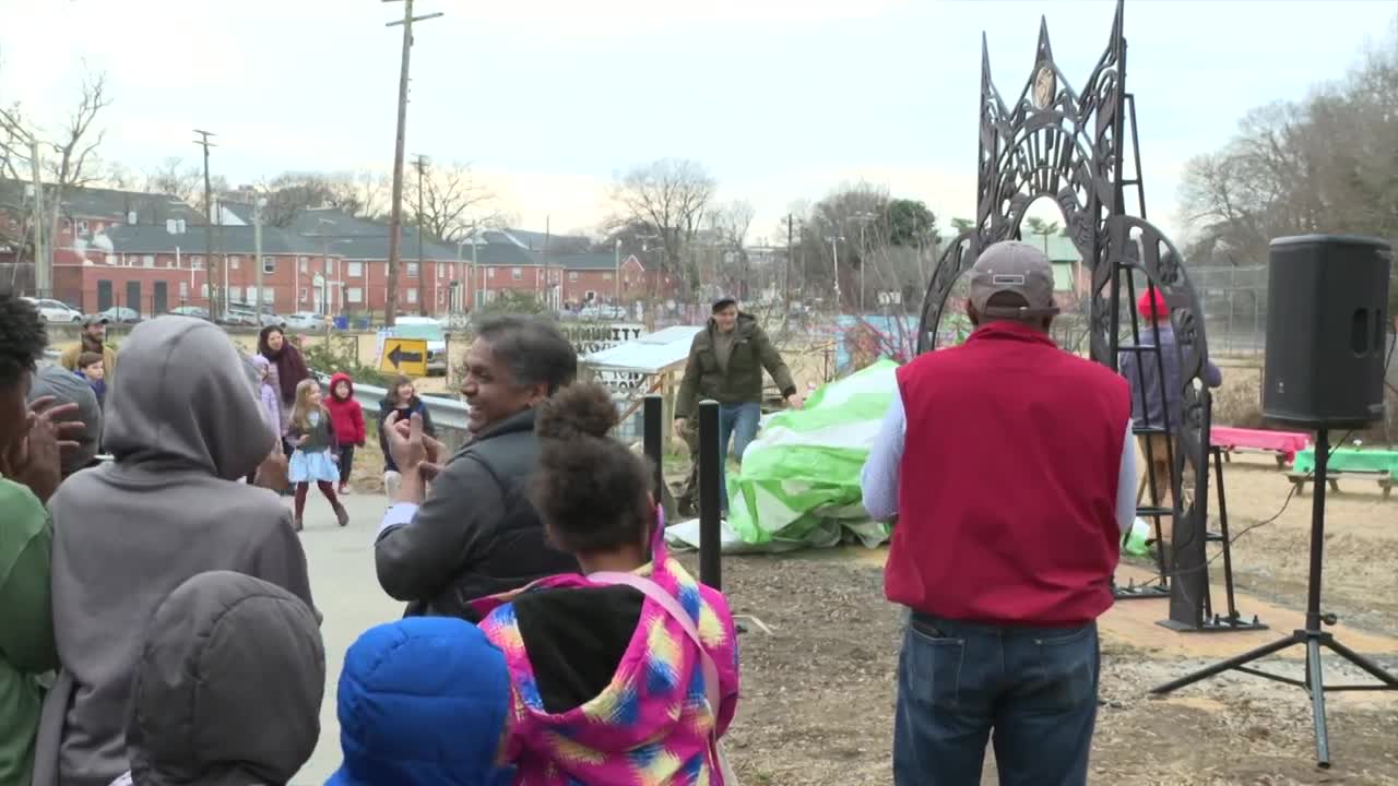 The artwork is displayed at a garden run by "Kinfolk Community," a workforce training program for young people. Officials with the organization call the new installation a gateway of possibilities for the residents of Gilpin Court.