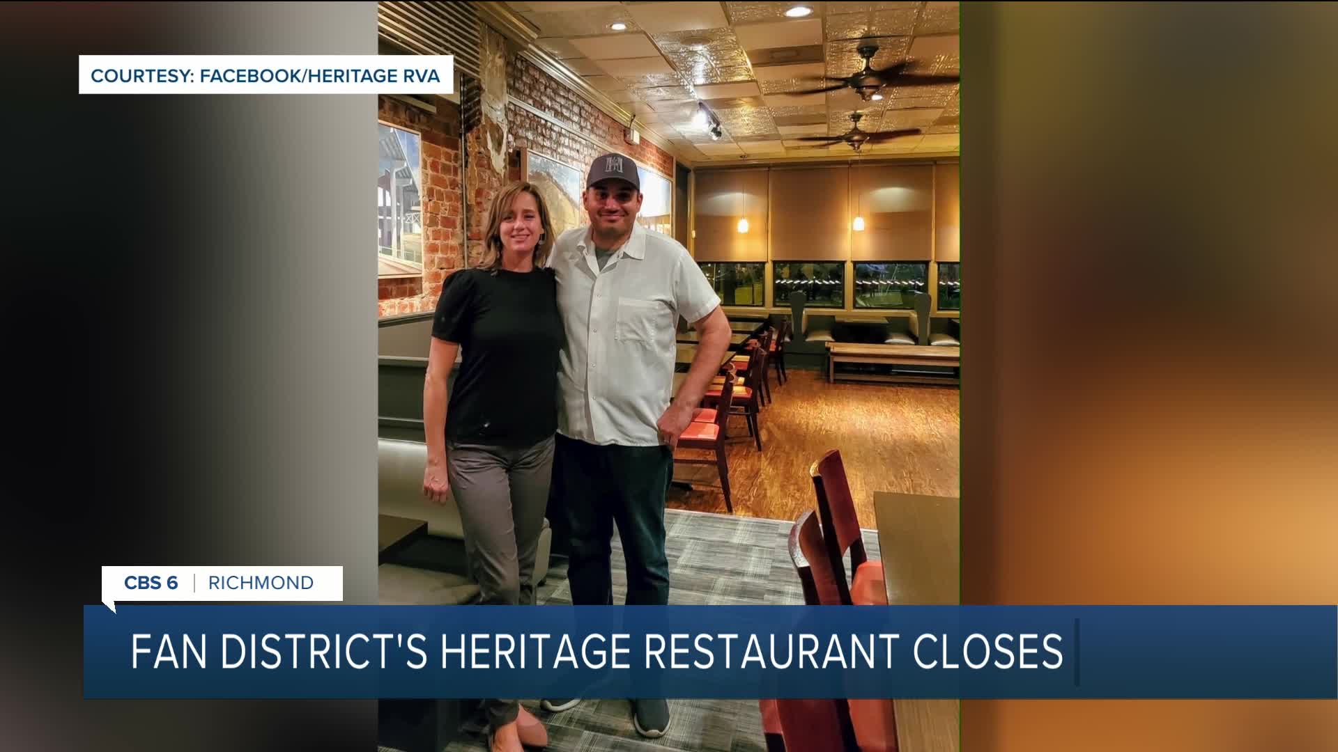 RICHMOND, Va. β Heritage, a beloved New American restaurant in Richmond's Fan District, will close its doors after 13 years of serving seasonal cuisine made from fresh ingredients.