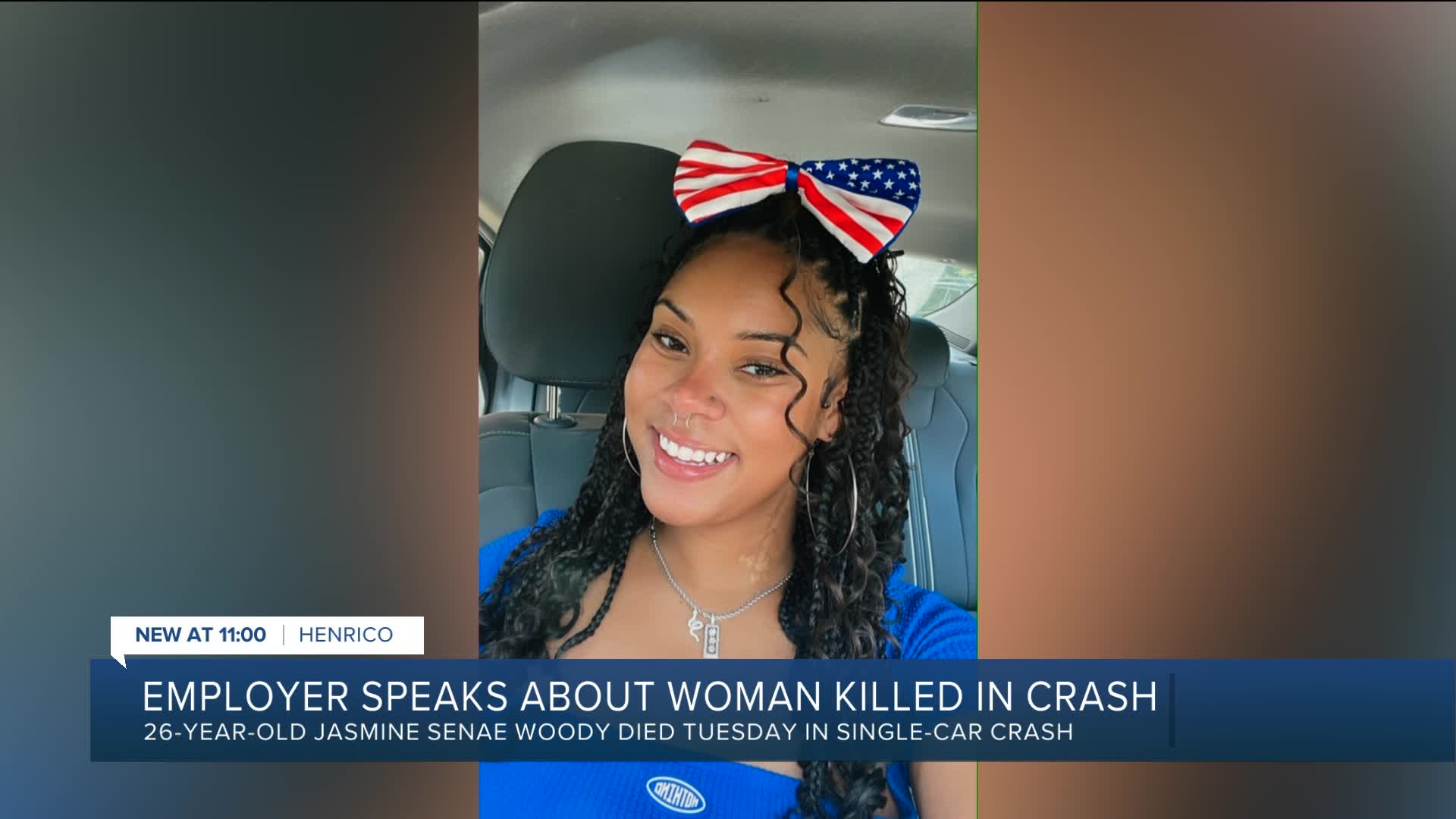 Jasmine Woody, 26, was killed in a crash along Kain Road just before noon Tuesday.