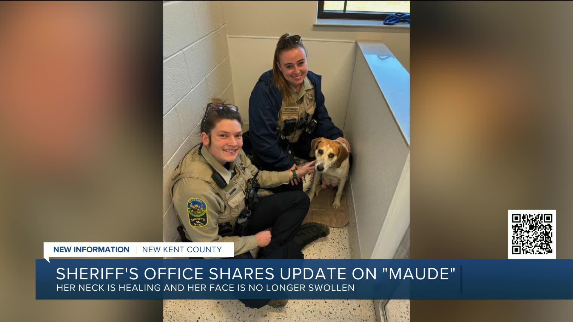 NEW KENT COUNTY, Va. — Maude, the pregnant hound who was found with wire wrapped so tightly around her neck that it caused immense swelling, is doing "exceptionally better," according to an update from New Kent Sheriff's Office Animal Protection.