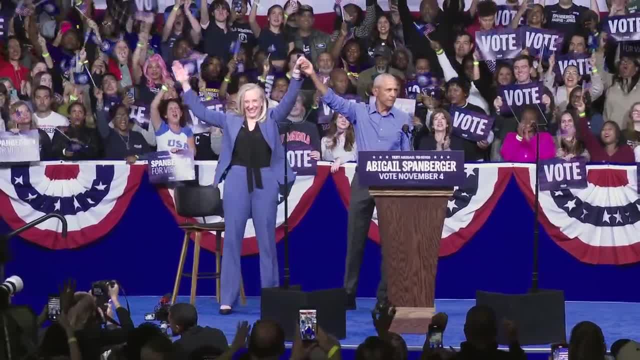 Obama's Saturday appearances for Abigail Spanberger and Mikie Sherrill contrast with Trump spending the weekend at his Mar-a-Lago estate in Florida, leaving Republicans Winsome Earle-Sears in Virginia and Jack Ciattarelli in New Jersey to campaign for themselves.