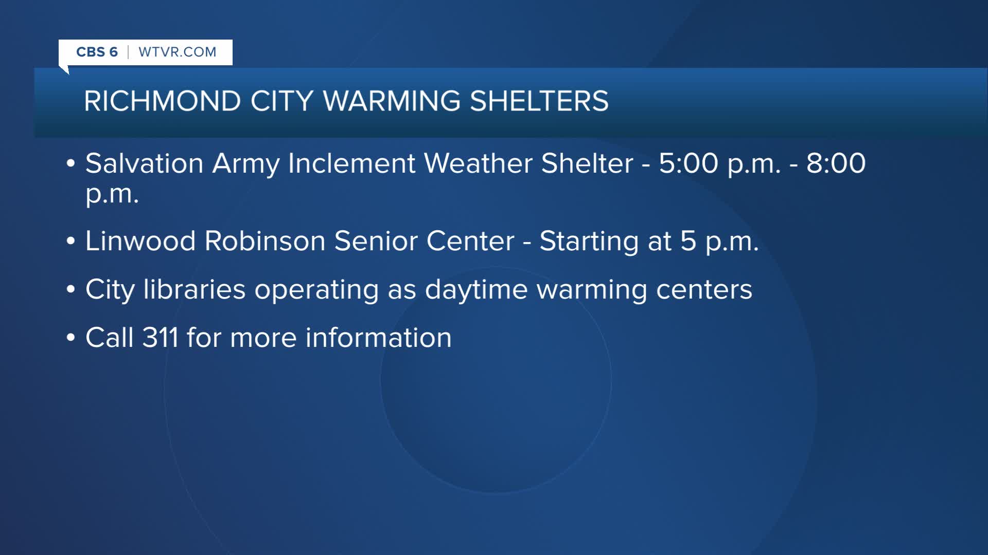 Anyone in need of a safe, warm place can visit the Salvation Army Inclement Weather Shelter at 1900 Chamberlayne Avenue or the Linwood Robinson Senior Center. The CARITAS Surge Shelter will also continue regular operations.