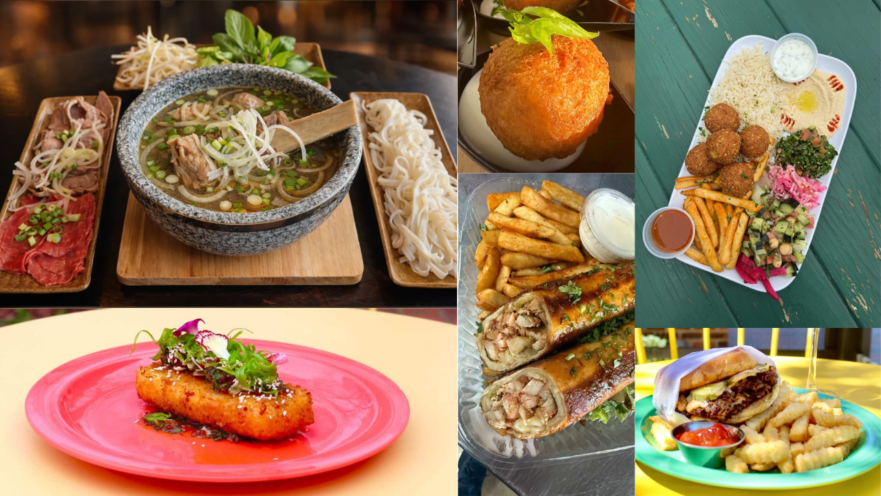 The menu includes smash burgers, jerk butter shrimp with coconut rice grits, crab bites, crispy blue oyster mushrooms and fried feta.