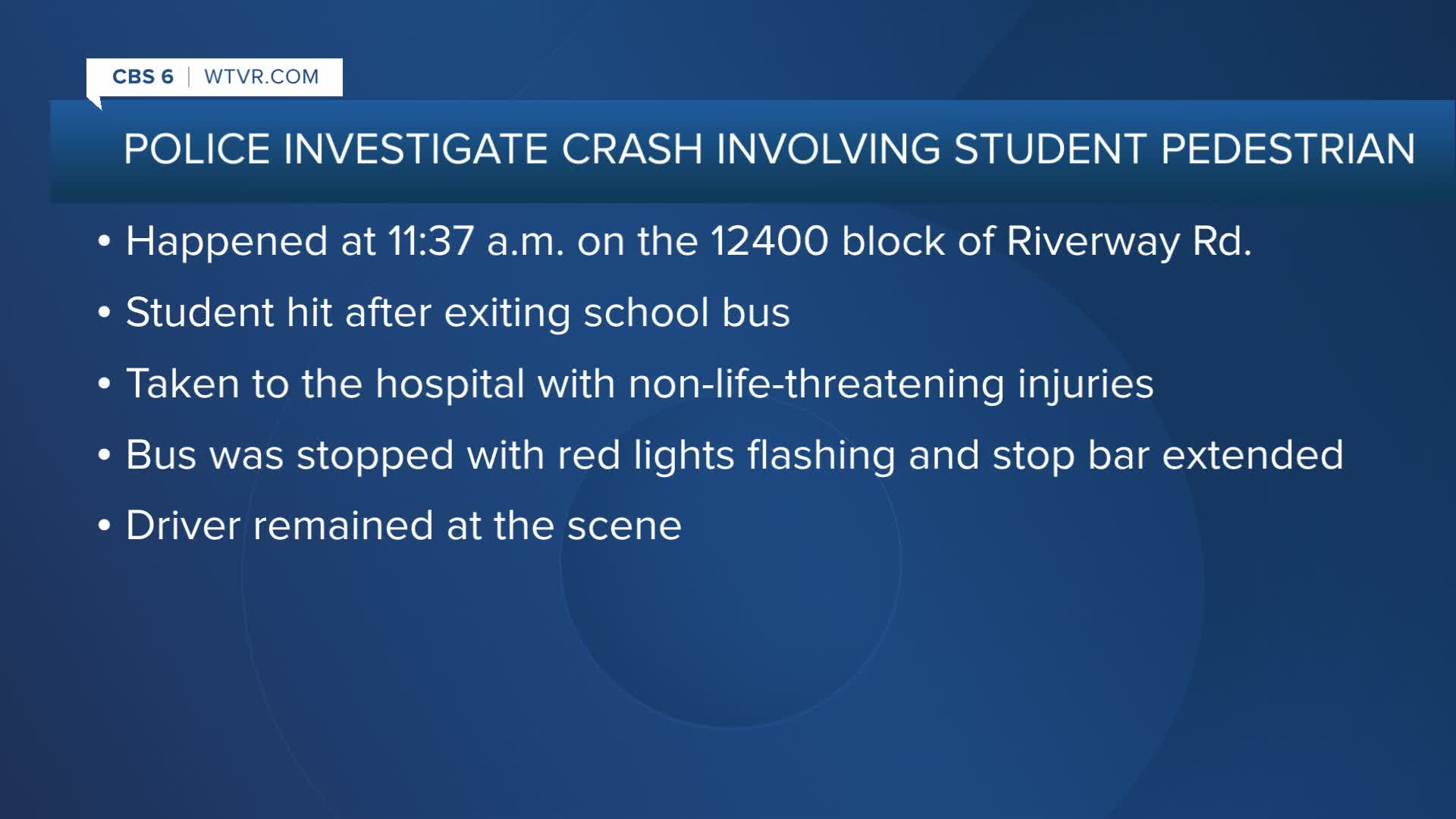 The student was getting off the bus in the 12400 block of Riverway Road at 11:37 a.m. when they were hit by a white Kia Sorento heading the opposite direction.