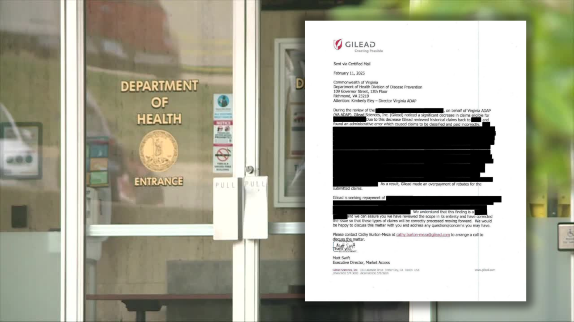 Gilead Sciences, a pharmaceutical manufacturer, first confirmed a rebate issue to CBS 6 last month. Now, we've learned through a Freedom of Information Act (FOIA) request that Gilead sent a letter to VDH in February 2025 alerting the agency of "an administrative error which caused claims to be classified and paid incorrectly." That resulted in Gilead overpaying rebates to VDH, according to the letter.