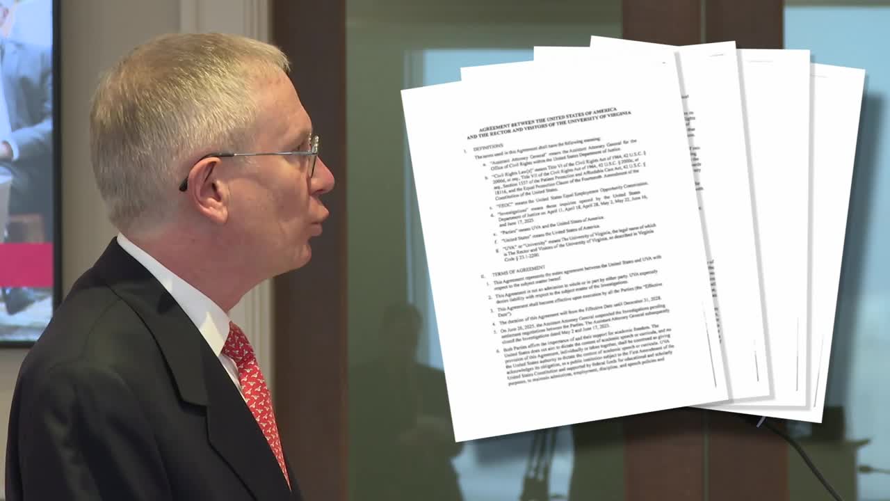 RICHMOND, Va. — The University of Virginia's interim president defended his agreement with the Department of Justice ending an investigation into alleged discriminatory DEI practices at the school to a group of state lawmakers at the State Capitol on Monday.