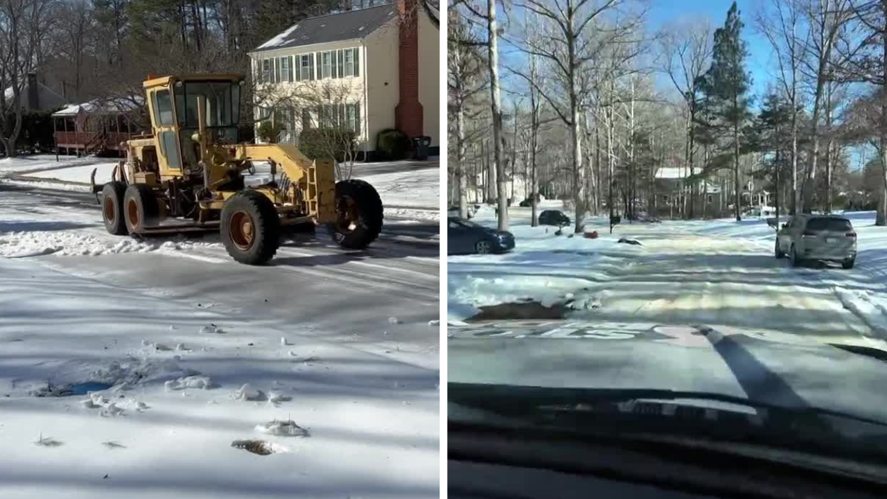 The remaining cleanup work is more challenging than typical snow removal because crews need heavy equipment to break up thick ice formations before roads become plowable. In North Chesterfield, heavy-duty road graders followed by road plows were observed chopping away at remaining ice on Shiloh Drive.