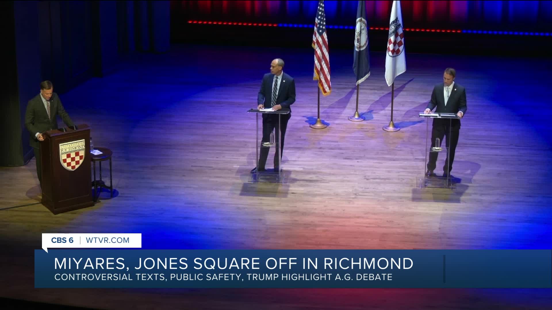 RICHMOND, Va. β Virginia's race for attorney general took center stage Thursday night as Democrat Jay Jones and Republican incumbent Jason Miyares faced off in a debate at the University of Richmond that immediately addressed two recent controversies surrounding Jones.