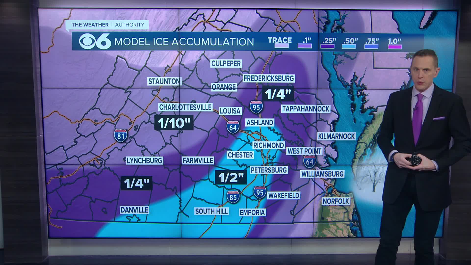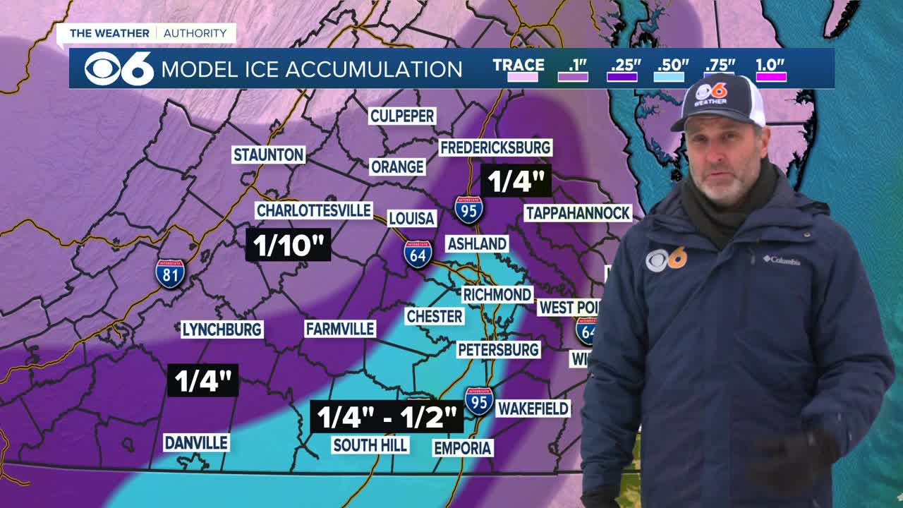RICHMOND, Va. β Winter weather in Central Virginia will transition to freezing rain during the course of Sunday, except for areas right against the coast, Northern Neck and Middle Peninsula, where plain rain is expected as temperatures rise above freezing. Ice accumulations are expected Sunday into the evening hours, creating potentially hazardous travel conditions and the possibility of power outages. Scroll down for updated power outage numbers.