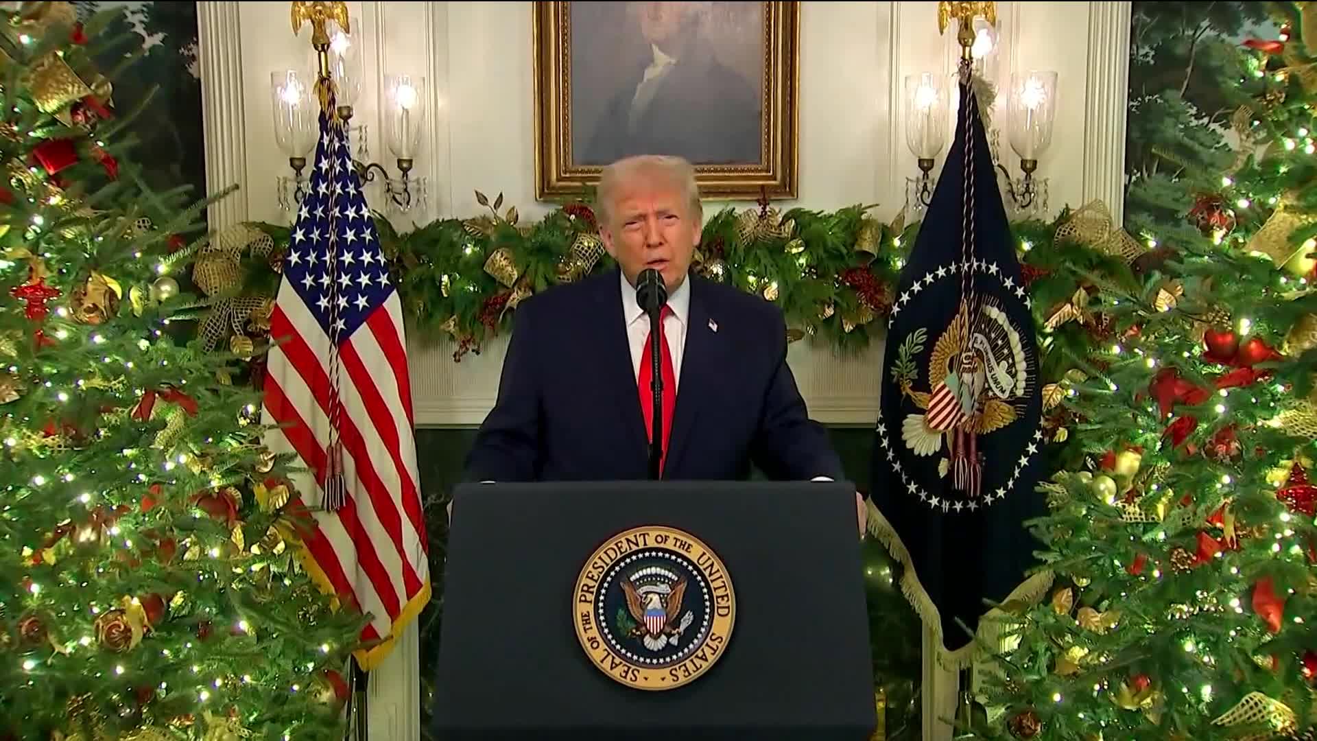 WASHINGTON (AP) — President Donald Trump delivered a politically charged speech Wednesday carried live in prime time on network television, seeking to pin the blame for economic challenges on Democrats while announcing he is sending a $1,776 bonus check to U.S. troops for Christmas.
