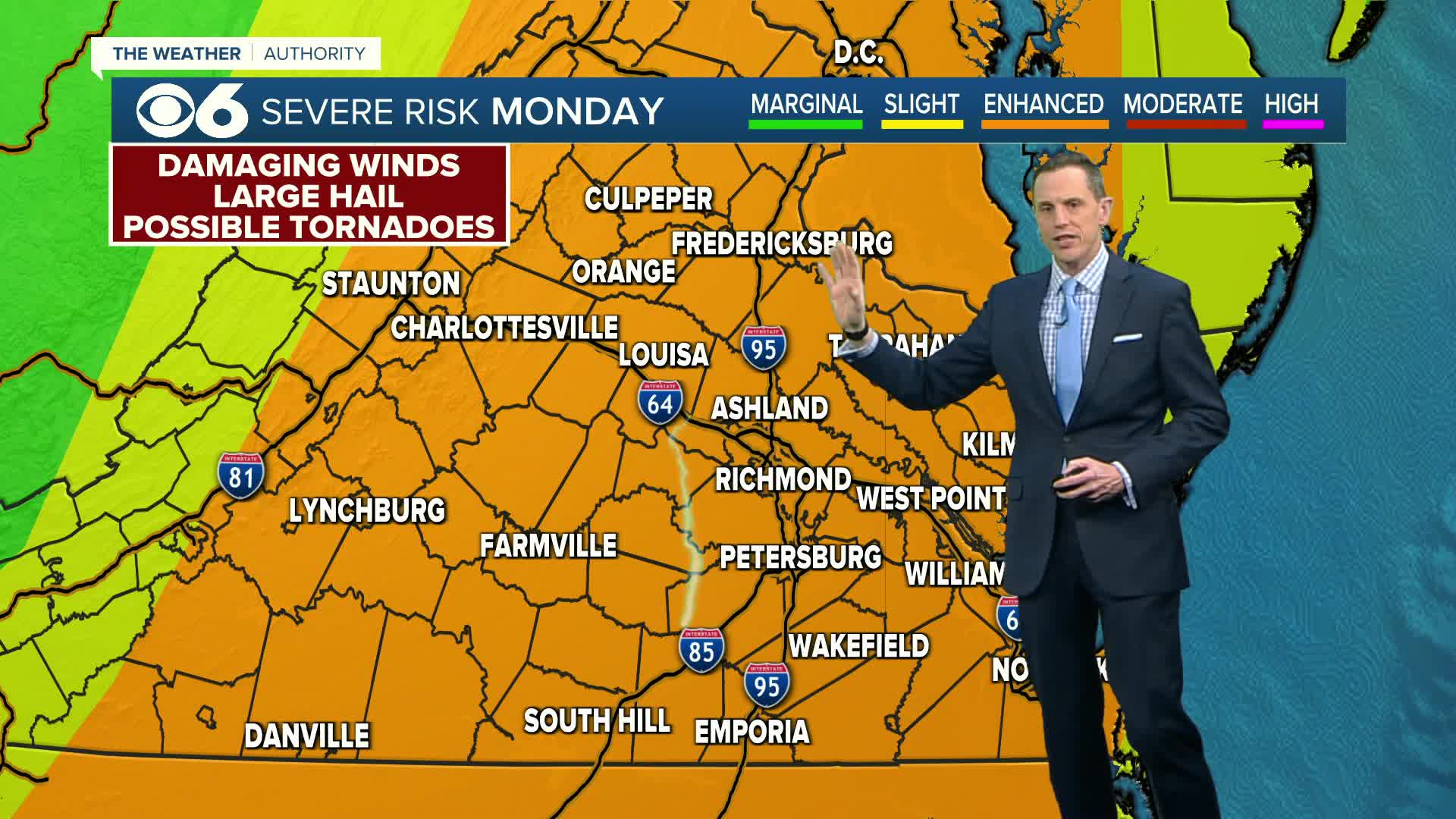 WATCH: Enhanced risk (Level 3) for severe weather Monday with potential for some tornadoes in Virginia