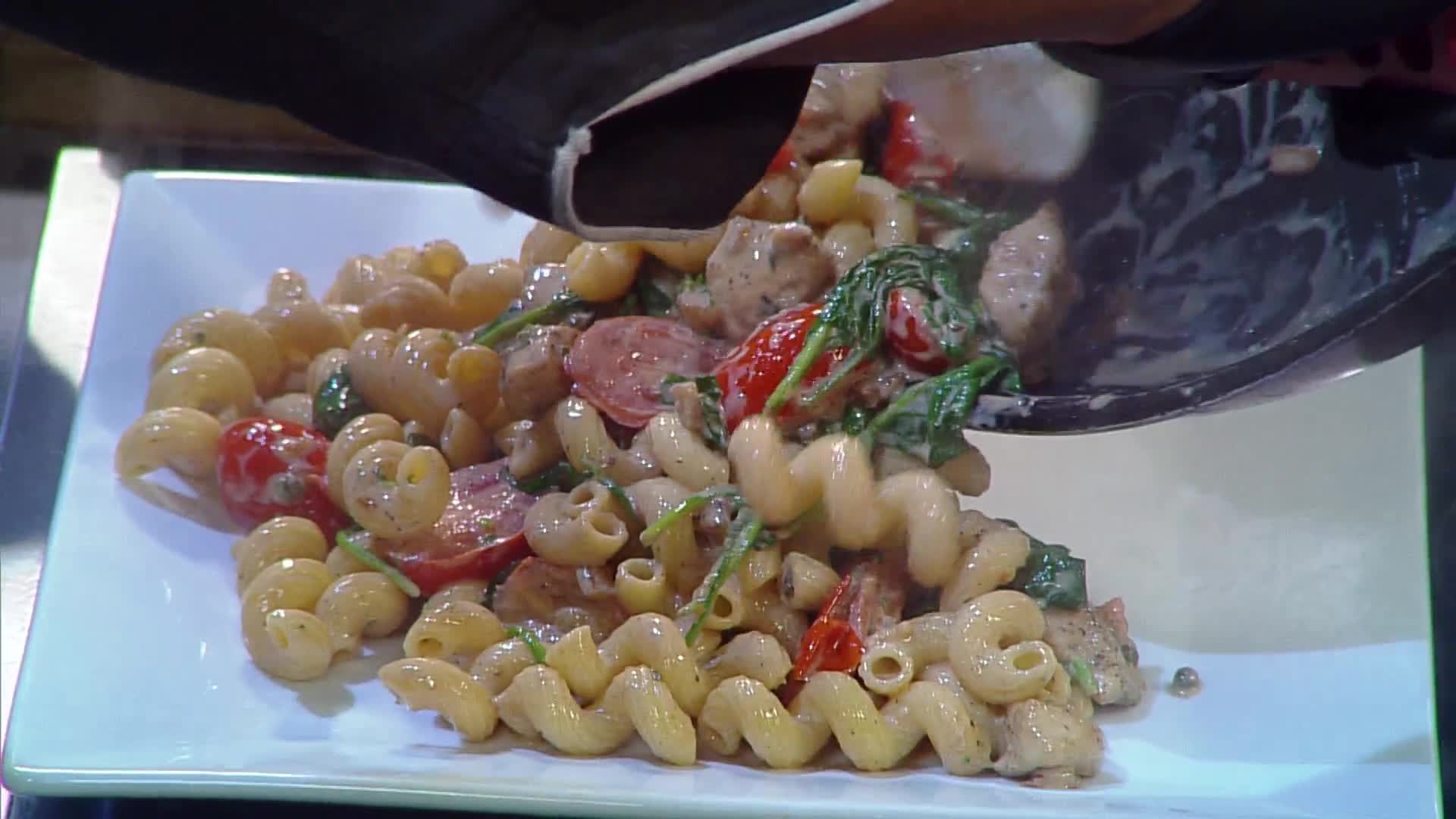 1. Cut the chicken breasts into ½ inch diced cubes. Sprinkle with salt, pepper and thyme. In a large, heavy-bottomed skillet, heat 1 tablespoon olive oil over medium high. Once hot, add the chicken breasts and sauté until lightly browned and reaches an internal temperature of 165 degrees F. Add onions, garlic, tomatoes and spinach to pan. Sauté on high heat for 2 minutes. Deglaze pan with white wine.