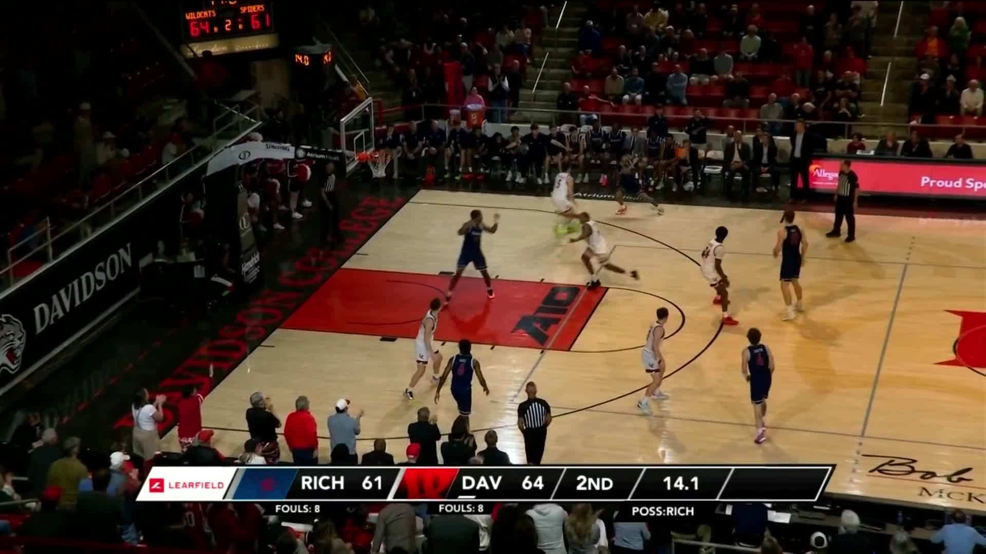 Davidson went into the half ahead of Richmond 35-24. Hunter Adam scored nine points in the half. Davidson used a 7-0 run in the second half to build an eight-point lead at 58-50 with 4:35 left in the half before finishing off the win.