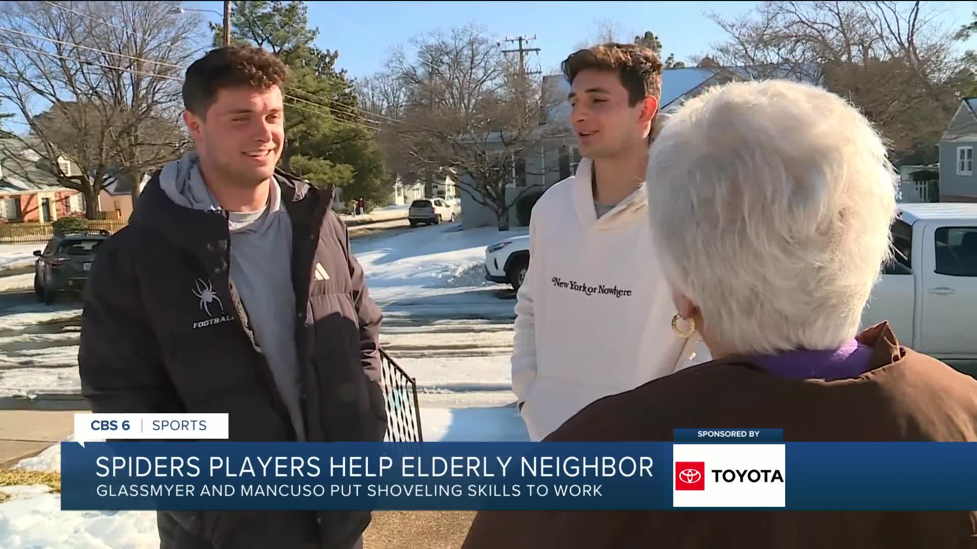 Carter Glassmyer and Trey Mancuso are teammates at the University of Richmond. Last week, after the snow and ice had paralyzed much of the area, they headed to the store for some groceries and couldn’t help noticing a woman attempting a very tall task in the snow.