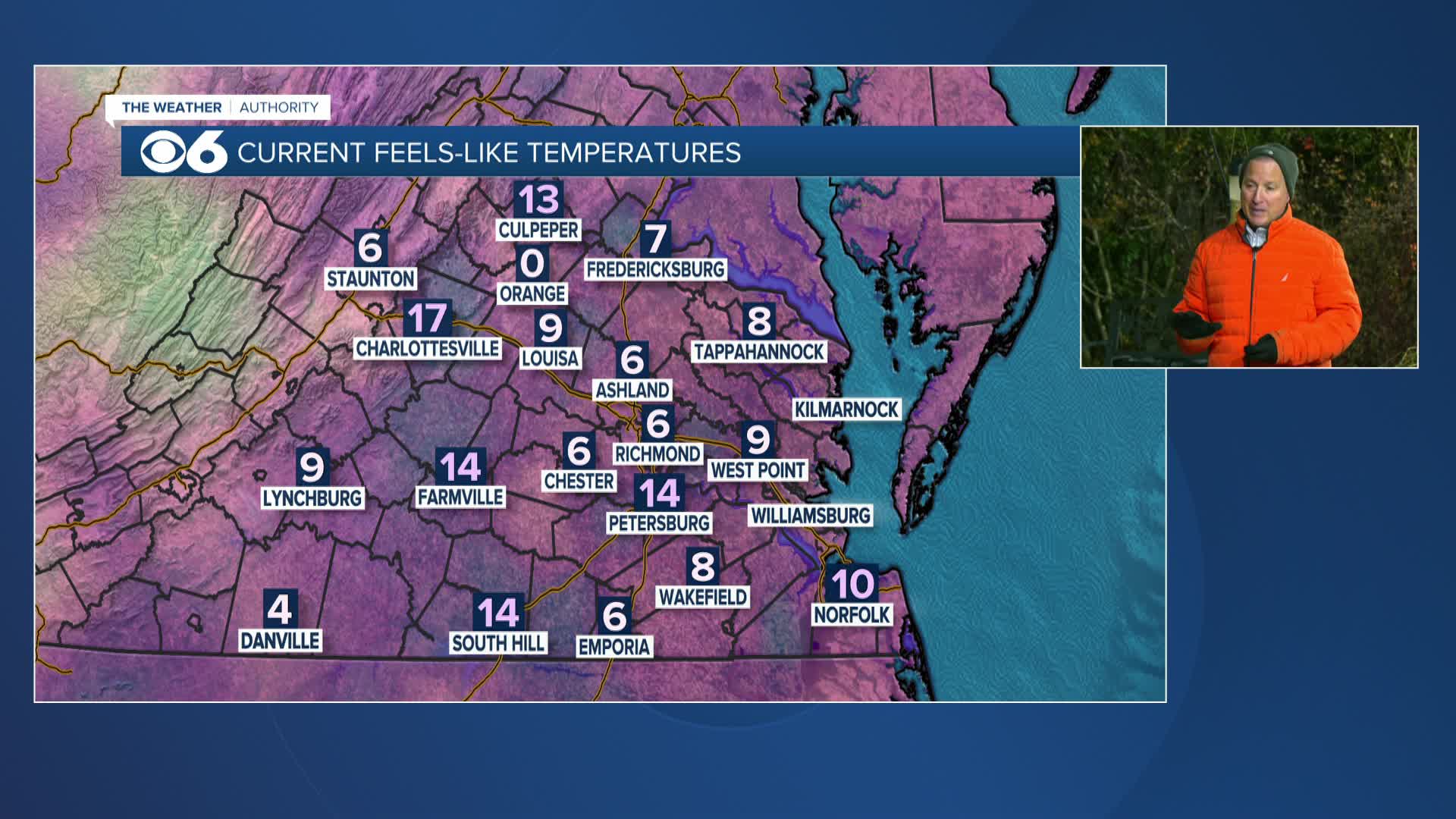 RICHMOND, Va. β It will be clear, breezy at times and very cold overnight, with wind chills in the single digits. Actual low temperatures will be in the teens. A Cold Weather Advisory was in effect through 9AM Monday morning.