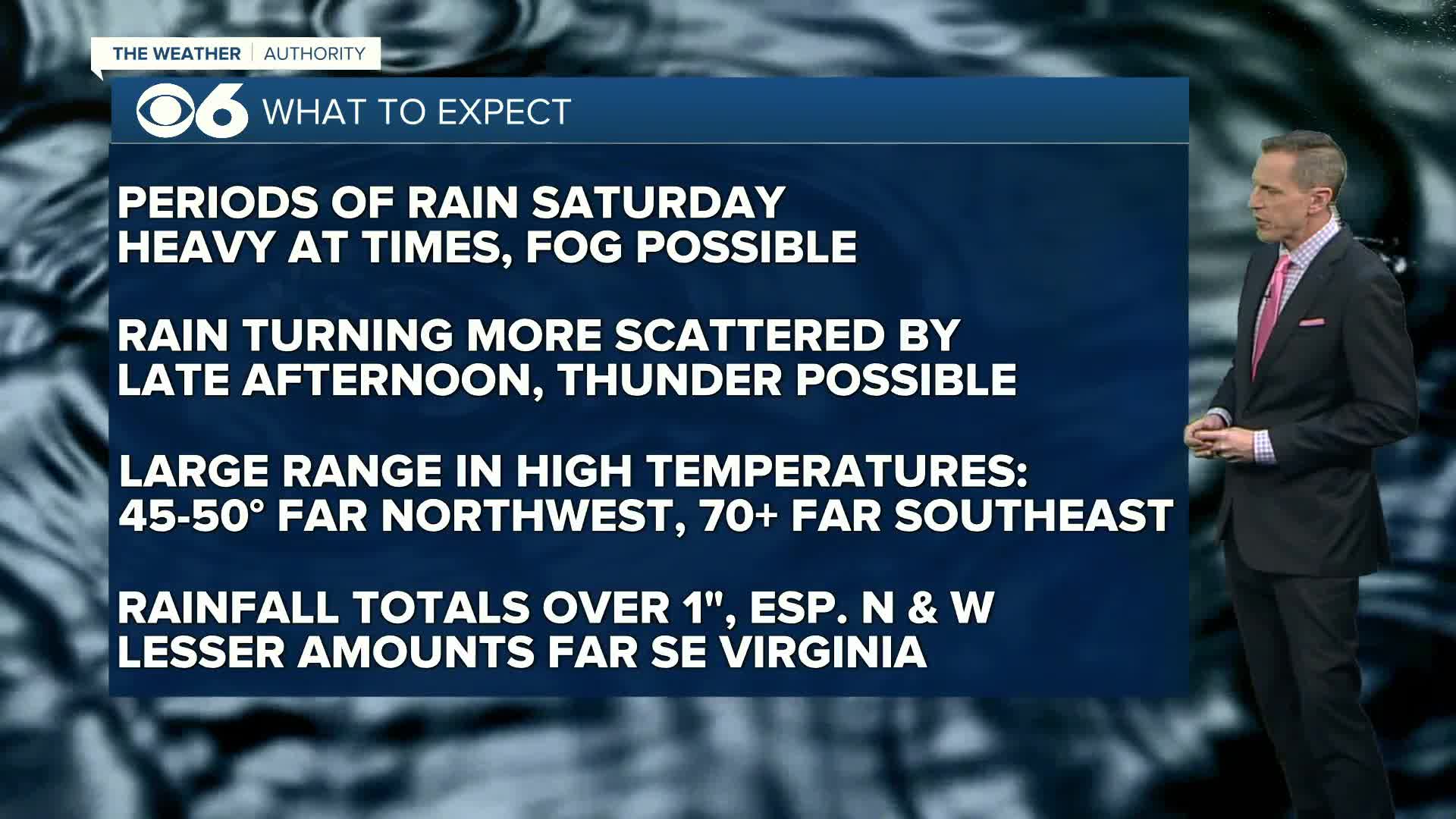 Rain will turn more scattered Saturday evening and Saturday night. Final rainfall totals will exceed an inch in many locations, with localized totals over two inches possible. Higher rain totals will be located north and northwest of Richmond. Southeastern Virginia will see lower rainfall totals, with some locations under one-half inch.