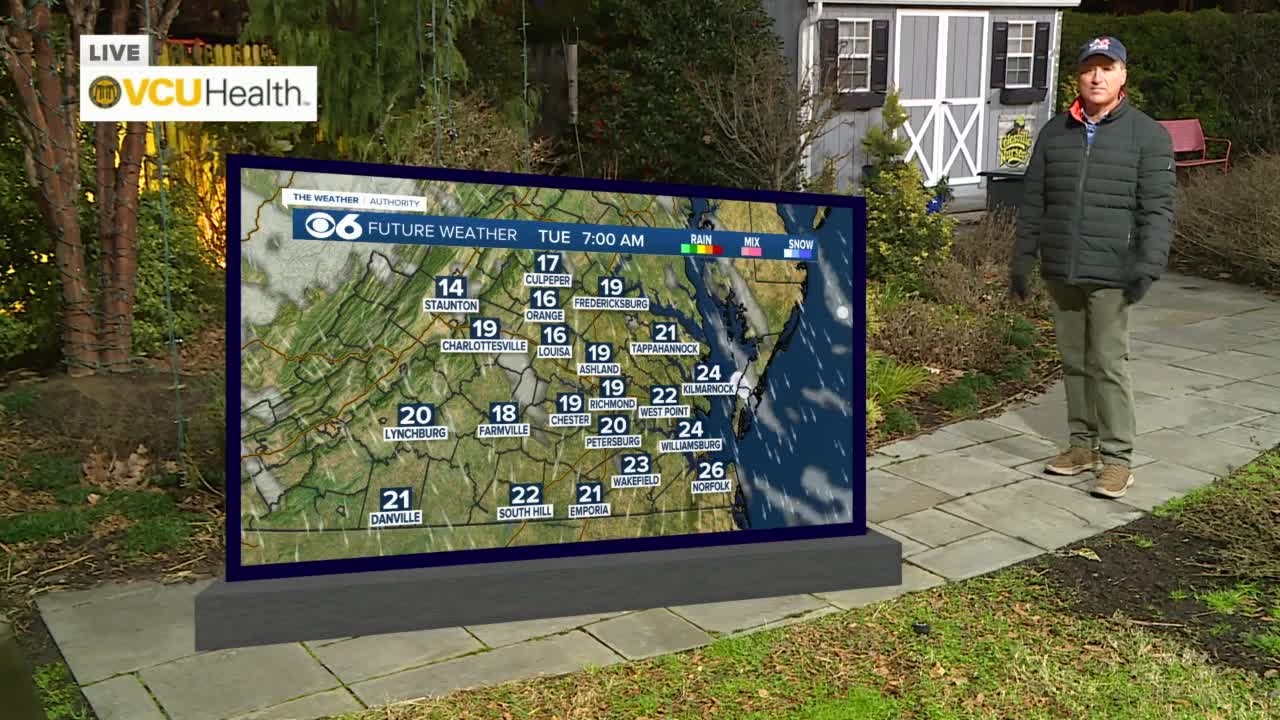 RICHMOND, Va. -- Today will be mostly sunny, but there will be a chilly breeze. It will be quite a bit colder, with afternoon highs in the low to mid 40s. Lows tonight will be in the upper teens.