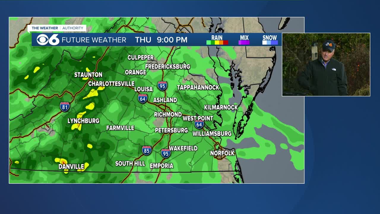 RICHMOND, Va. β Thursday will have thickening clouds as a storm system approaches. Some showers will be possible in the afternoon, mostly well west of I-95. Highs will be 55-60.