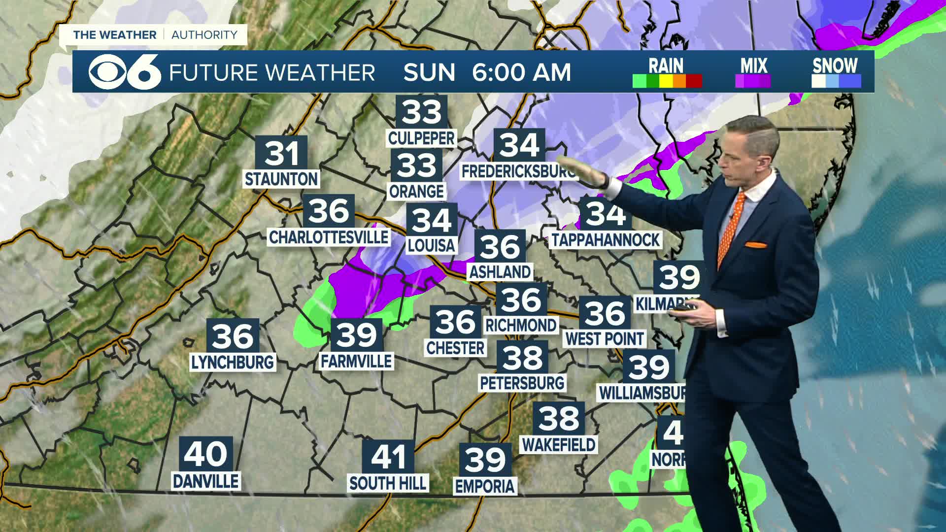 A dusting of snow is possible, with the best chance east of I-95. Snow accumulation of a coating to under 1" will be possible in Richmond and areas north of I-64. The best chance for an inch of snow will be far northern Virginia, but this could extend into the northern part of the Northern Neck.